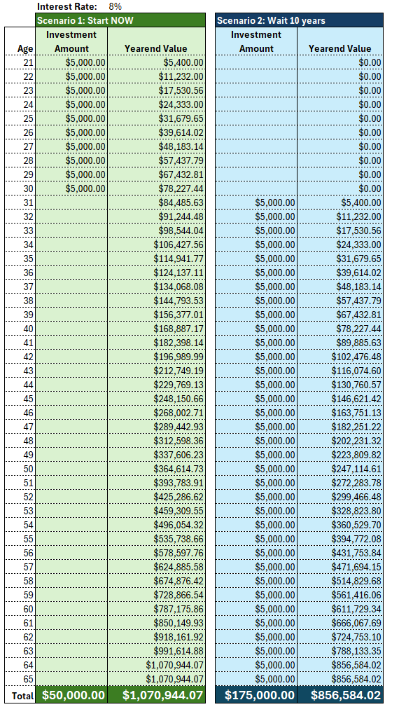 Why do you need to act ASAP? This is another topic that deserves its own blog post; look for that here soon. The short answer is: compounding is THE magic sauce in the financial independence journey and compounding needs time to work. The sooner you act, the more time compounding has to work for you. Compounding is simple: it’s the snowball effect you get from earnings that accumulate not only on your initial investments but also on previous earnings. The concept is simple. Let’s say you can earn 10% on your initial investment of $1,000. The first year, you earn $100 (10% of $1,000). But since you understand the value of compounding, you leave that new $100 invested and you now have $1,100 to begin year 2. In year 2, you earn $110 (10% of $1,000). And note that you did this with 0 effort on your part. Year 3, you start with $1,210 ($1,000 + $100 + $110) and your earnings jump to $121. You get the idea, simple, right? Despite the simplicity, the human mind can barely comprehend the power of compounding over larger amounts of time. Take a look at the simple chart below illustrating the power of compounding. I used a more conservative interest rate of 8% here. Scenario 1 person invests $5,000/year for the first 10 years, then never invests another penny. Scenario 2 person, waits 10 years then invests $5,000/year for the next 35 years. Despite investing less than a third of scenario 2, scenario 1 ends up with over $200,000 more! This is why it’s crucial to start now.