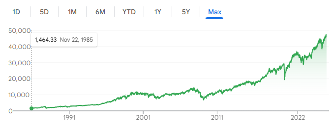 Item 6 is the simplest to answer but possibly the hardest to follow. The simplest way is to pull up a graph of the S&P 500, Dow Jones Index, or similar and zoom all the way out. Below is the Dow Jones Industrial Average from Nov 1985 – Nov 2025. You can see the trend is always up although the road is often bumpy. You need to get comfortable thinking “big picture” so that you don’t panic and sell during the inevitable down swings.